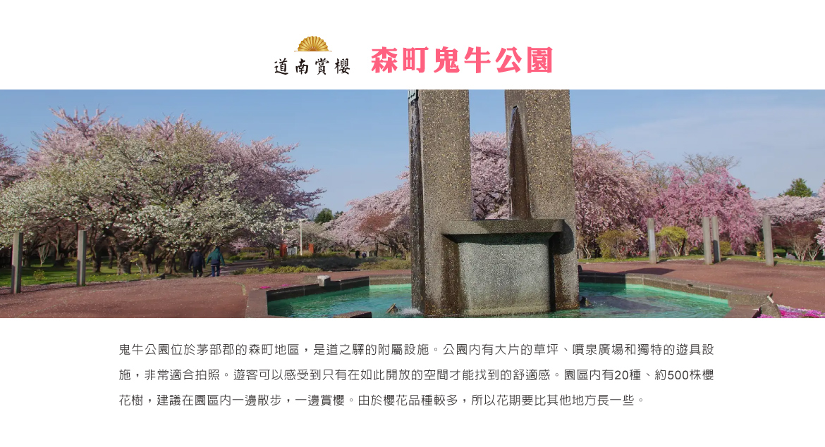 【森町鬼牛公園】鬼牛公園位於茅部郡的森町地區,是道之驛的附屬設施。公園內有大片的草坪、噴泉廣場和獨特的遊具設施,非常適合拍照。遊客可以感受到只有在如此開放的空間才能找到的舒適感。園區內有20種、約500株櫻花樹,建議在園區內一邊散步,一邊賞櫻。由於櫻花品種較多,所以花期要比其他地方長一些。還能欣賞到「駒見櫻」和「堀井緋櫻」等森町特有的櫻花品種。深色和淺色相間其中的花瓣是這種櫻花的特徵,非常罕見。