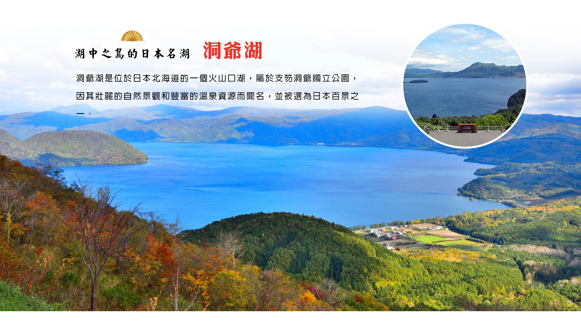【洞爺湖展望台】位於日本北海道,橫跨虻田郡洞爺湖町和有珠郡壯瞥町兩町的一個湖泊。屬二級河川長流川水系。屬於支笏洞爺國立公園。20 世紀初葉火山爆發頻繁,陷沒後形成了這座湖泊。洞爺湖由於湖面較寬闊,相比之下外輪山離湖面的比較低,只有 200~500 公尺,所以給人一種十分廣闊的感覺。 此外,洞爺湖也被選入日本百景、新日本旅行地100選、美麗的日本 想走走看的城鎮500選。
