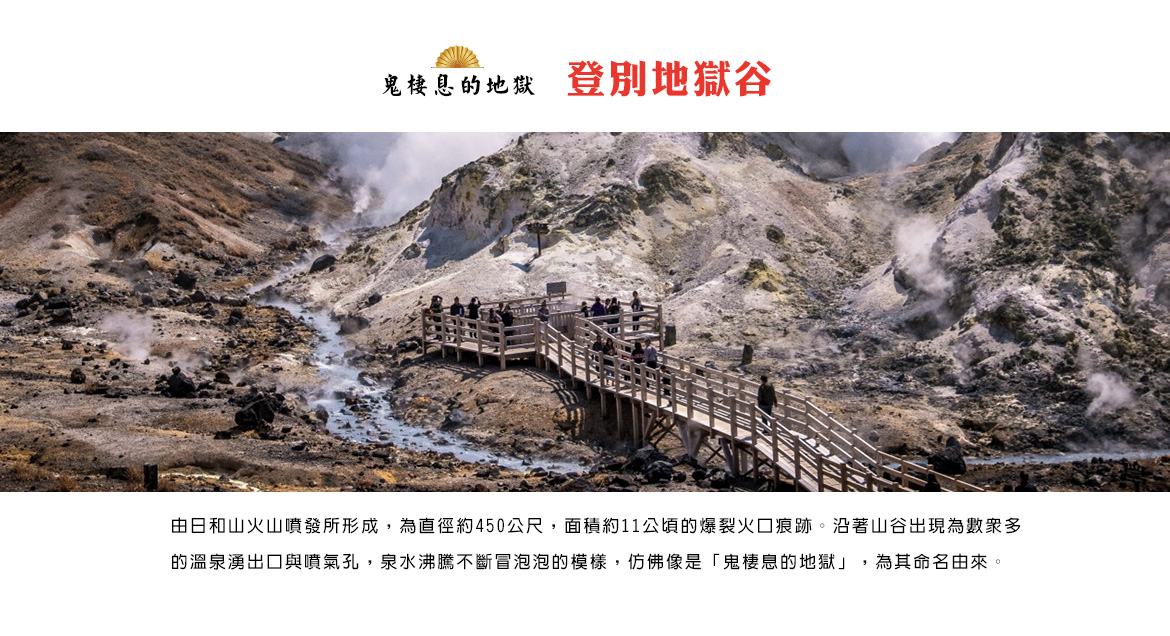 【登別地獄谷】地獄谷是位日本北海道登別市的一個火山口遺跡,鄰近洞爺湖,大約在一萬年前形成,有直徑大約450米的地方依然在噴白煙,而且寸草不生,又有強烈硫磺味,由於就像在地獄之中,因而得名。地獄谷提供多達11種不同礦物質的泉水給附近的有名的登別溫泉,早在百多年前已有人懂得在地獄谷開採泉水。