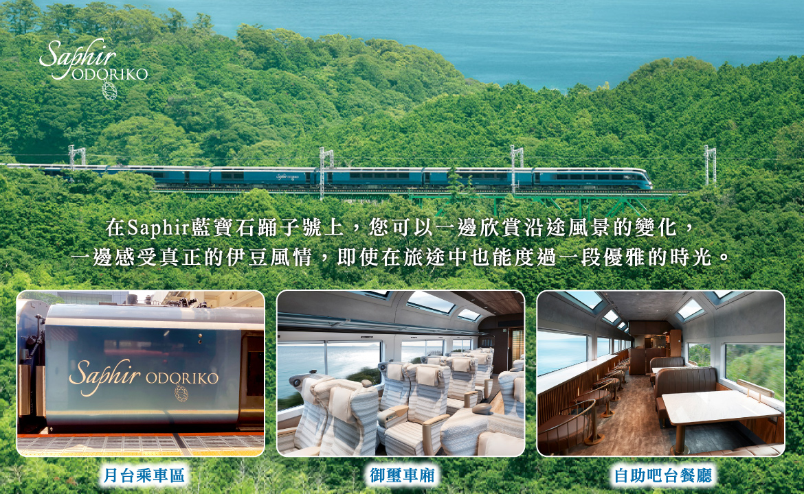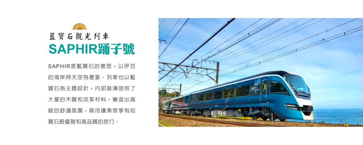 【SAPHIR踊子號】是行駛於「東京」到「伊豆半島」之間的觀光特急列車,SAPHIR是藍寶石的意思,是以伊豆的海岸與天空為意象。列車也以藍寶石為主題設計,車身採用藍色塗裝,內部裝潢使用了大量的木質和皮革材料,營造出高級的舒適氛圍,期待讓乘客享有如寶石般優雅和高品質的旅行。