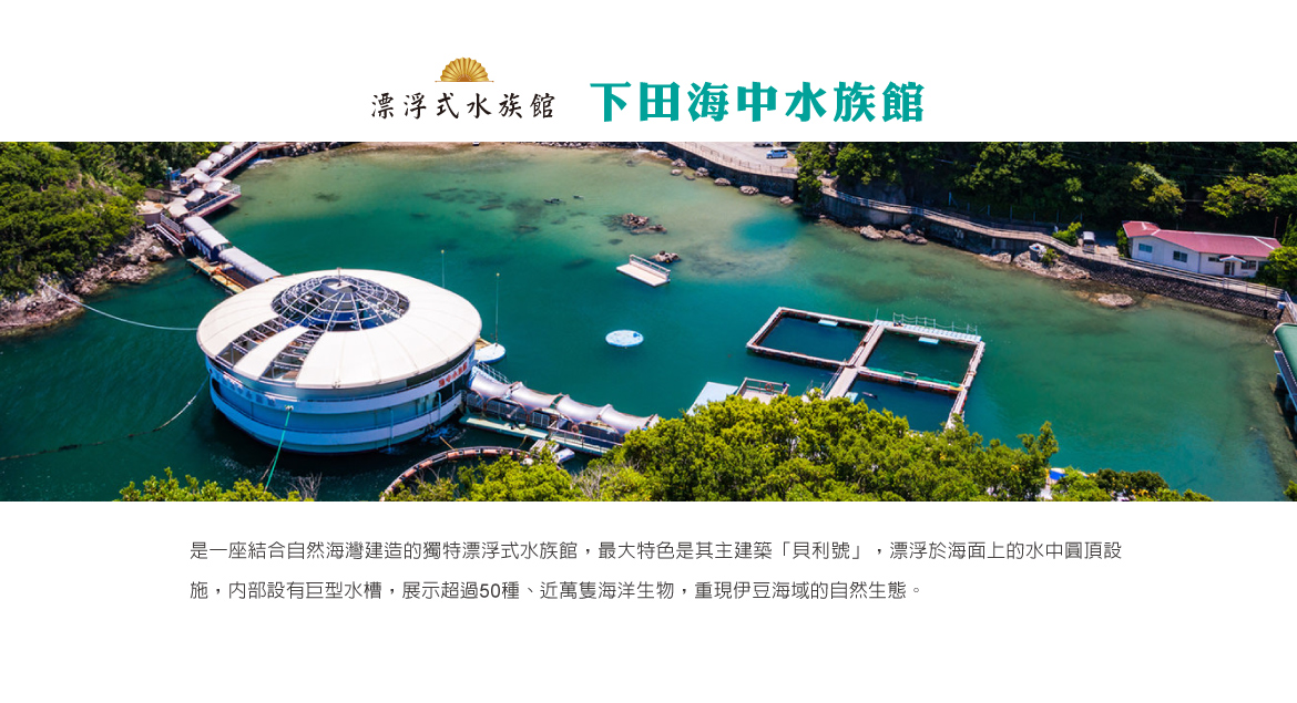 【下田海中水族館】是一座結合自然海灣建造的獨特漂浮式水族館,最大特色是其主建築「貝利號」,漂浮於海面上的水中圓頂設施,內部設有巨型水槽,展示超過50種、近萬隻海洋生物,重現伊豆海域的自然生態。水族館主打與動物的近距離互動體驗,特別是與海豚共游、觸摸海豚、餵食小爪水獺等活動,每日還有海豚與海獅的表演,讓遊客能真切感受海洋生命的可愛與智慧。