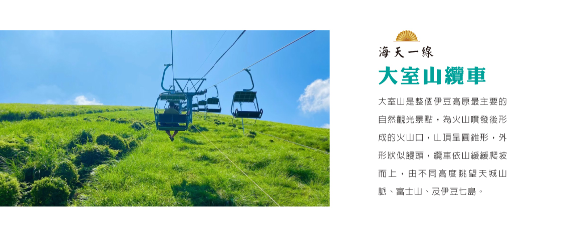 【大室山登山吊椅】大室山是整個伊豆高原最主要的自然觀光景點,為火山噴發後形成的火山口,山頂呈圓錐形,外形狀似饅頭,登山吊椅依山緩緩爬坡而上,由不同高度眺望天城山脈、富士山、及伊豆七島,眼前海天一線開闊無邊的感動,登頂後可沿火山口步道環繞一圈,山頂還有供奉順產與結緣神明的淺間神社。