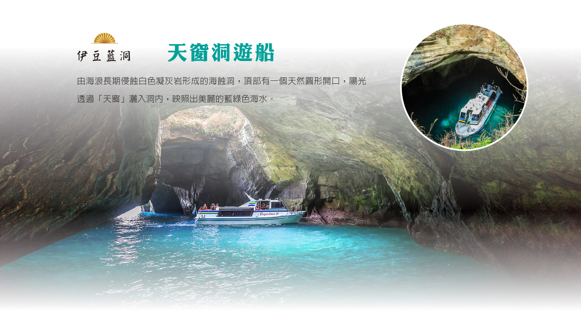 【天窗洞遊船】是由海浪長期侵蝕白色凝灰岩形成的海蝕洞,頂部有一個天然圓形開口,陽光透過「天窗」灑入洞內,映照出美麗的藍綠色海水,因此又被稱為「伊豆的藍洞」。遊客可搭乘堂島Marine的遊覽船進入洞內,體驗約20分鐘的神秘海上之旅,感受光影與海水交織的夢幻氛圍。