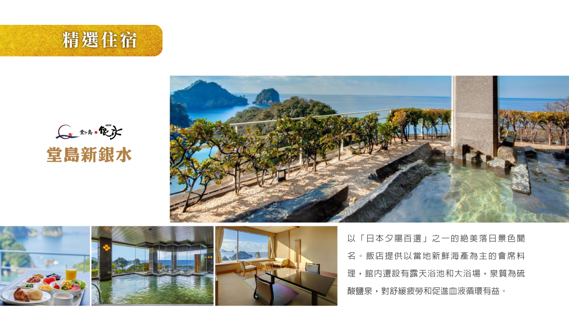 【堂島溫泉】位於西伊豆海岸,旅宿多沿著海岸而建,因此泡湯時常能直接看到太平洋的遼闊海面、奇特的海蝕岩岸與日落餘暉,景色壯麗又帶點療癒的靜謐感。這裡泉質多屬柔和、易親膚的類型,泡起來滑順舒適,適合希望透過溫泉舒緩旅途疲勞、簡單放空的人。