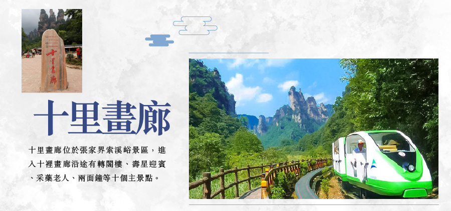 【十里畫廊含單程小火車(下車參觀)】在這條長達十餘里的山谷兩側,有著豐富的自然景觀,人行其間如在畫中。是峽谷兩旁的巒峰錯落有致,並且隨著天氣和光線變化,呈現如詩如畫的景緻而得名,看起來真似國畫長廊。溝旁黛峰屏列,山上的岩石形成了200來尊似人似物、似鳥似獸的石景造型,其中“孔雀開屏”、“採藥老人”、“壽星迎賓”、“猛虎嘯天”等最為著名。