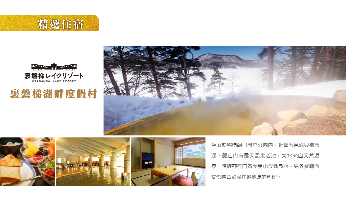 住宿:土湯溫泉YUMORI 或 裏盤梯渡假村五色之森 或 大江戶溫泉東山格蘭飯店 或同等級