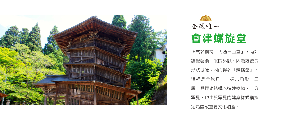 使人蒙蔽的外觀從外面觀看這座寶塔型的寺廟,似乎與其它寺院沒什麼不同,但若進入其中就會發現會津螺旋堂的獨特之處,此處設置了兩座外型如同海螺殼的螺旋樓梯,此亦為螺旋堂名稱的由來。