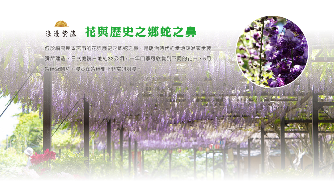 位於福島縣本宮市的花與歷史之鄉蛇之鼻,是明治時代的當地政治家伊藤彌所建造,日式庭院占地約33公頃,一年四季可欣賞到不同的花卉,5月紫藤盛開時,漫步在紫藤棚下非常的浪漫。秋季也是賞紅葉的好去處,倒映在水面上的紅葉水鏡,美不勝收,這裡也可以算是日本東北隱藏版的紅葉秘境。