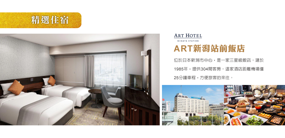 住宿:新潟ART飯店 或 新潟日航 或 新潟ANA CROWNE 或 新潟第一飯店 或同等級