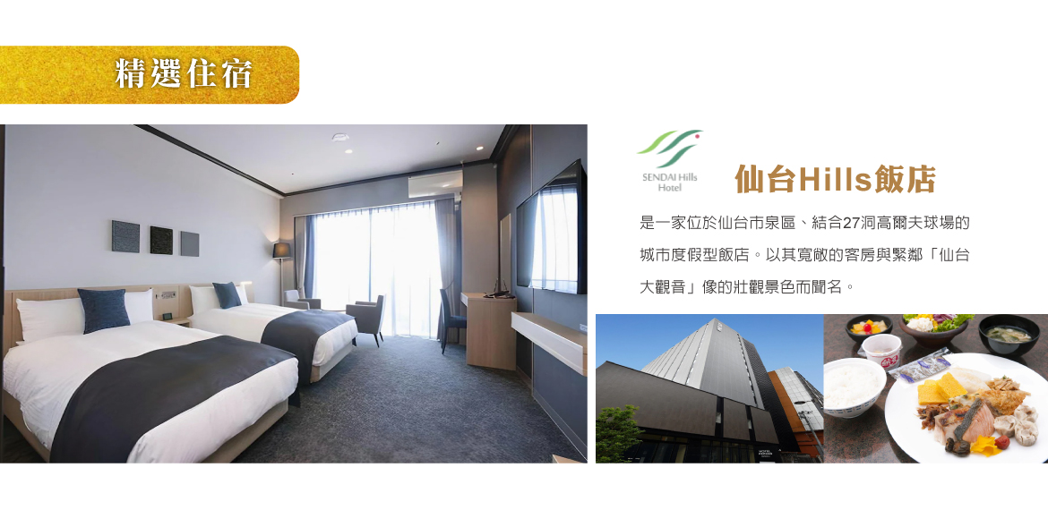 住宿:仙台HILLS 或 仙台京阪 或 仙台國際 或 仙台HOLIDAY INN 或同等級