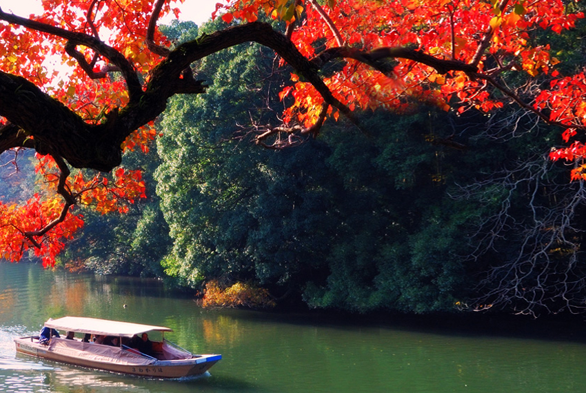 【堀川遊覽船】(紅葉預估時間11月中旬~12月上旬)遊船以傳統木製和風小舟打造,設計低矮,能穿越多座拱橋,沿著環繞松江城的護城河行駛,全長約3.7公里,乘船一圈約50分鐘。沿途可欣賞松江城壯麗的天守閣、武家屋敷與町家建築,船夫以竹竿操舟,用幽默的口吻介紹松江的歷史與文化,使旅程更添人情味。