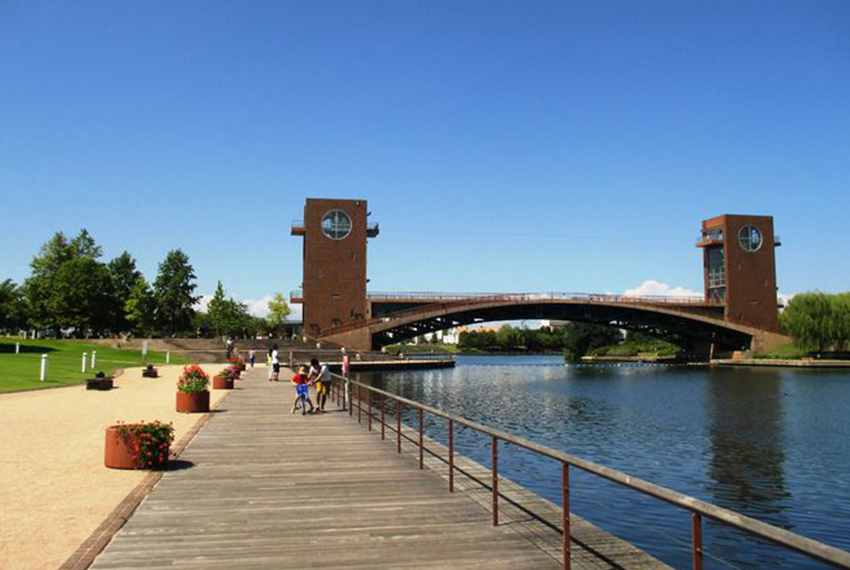 【富岩運河環水公園】公園以富岩運河為軸心,規劃了廣闊的草地、觀景步道以及親水平台,四季更替下呈現不同風貌。公園中的地標天門橋,橋上設有兩座玻璃觀景塔,可俯瞰公園全貌,還有被稱為世界最美星巴克之一的環水公園店,坐擁湖畔與大面積落地窗,非常適合休憩放鬆。